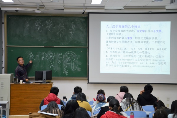 《汉字的发展演变与考释方法》讲座围绕汉字的发展演变和文字考释中的方法这两部分展开。“汉字的发展演变”这部分的主要内容包括文字学分支,语言与文字,文字起源,汉字性质,汉字发展演变,汉字发展的几个特点六个方面。在讲座过程中,为了使现场气氛活跃,学生们能更好地感受到文字的魅力,伊老师通过在黑板上板书“龟、饮”等字的发展演变过程来引起同学们学习的兴趣。在讲到语言与文字的关系时,伊老师借用电视剧《潜伏》里面的情节和交通标志,来让同学们更好地了解到“不跟语言产生关系的就不是文字”这句话的含义。“文字考释中的方法”部分包括字形分析的两种角度,字、词的关系,熟悉各时代字体的特点,尤其是历时的变化规律。伊老师通过“涮”字的造字意和使用意的区别来说明“造字之由不等于词的语用意”,同学们通过伊老师的例子更为直观地理解了这句话的含义。最后,伊老师总结,在考释文字的过程中,我们既要立足字形、关注字与词的关系,又要有文献佐证。整场讲座深入浅出,趣味横向,同学们都沉浸在其中。