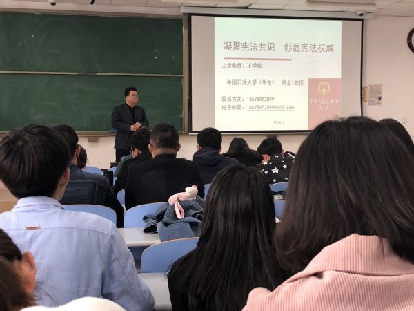 典礼结束后,文学院院长王学栋教授为全体学员做了主题为《凝聚宪法共识,彰显宪法权威》的讲座。首先,王学栋教授对2018宪法修正案的主要内容进行了详细的讲解,并按时间顺序梳理了历年宪法改革的内容,其中就1982宪法改革进行了详细的解释说明,他强调每一次宪法的修正都是与国情息息相关的。其次就有关于宪法日益受到重视的原因以及表现进行了全面的阐述,他特别指出要完善国家工作人员学习宪法法律的制度,起到:“带头尊崇宪法,学习宪法,遵守宪法,维护宪法,运用宪法,做尊法学法守法用法”的模范作用。最后还以一系列栩栩如生的案例讲述了宪法权威的意义,他提到国家宪法日的建立是完善宪法的一个重大举措,要加强宪法学习宣传,把宪法法律教育纳入国民教育体系中,引导青少年从小掌握宪法法律知识,养成遵法守法的习惯。活动中,王学栋教授以幽默风趣的话语突破了传统理论性灌输的枯燥方式,使得在场的师生在愉悦欢快的氛围中完成了宪法法律知识的学习。