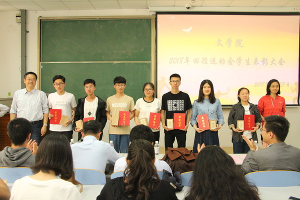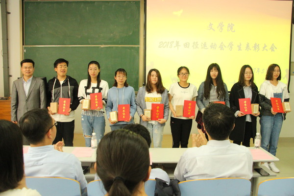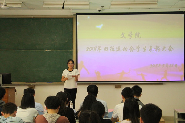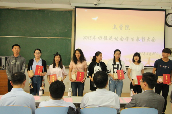 为传承运动健儿敢于拼搏、优秀志愿者乐于奉献的精神,并加强文学院学生体育运动锻炼意识,文学院于5月28日在南教楼106室举行文学院2018年田径运动会学生表彰大会。本次表彰大会由学院团委书记赵振华主持,党委学生工作部副部长陈文军、校团委副书记石国卿、体育教学部副主任王海滨、体育教学部教师史海鹏、文学院院长王学栋、党委书记张永宁、党委副书记邹维忠受邀出席,文学院辅导员、参赛运动员、运动会志愿者、全体党员、班委会成员以及体育运动爱好者参加。