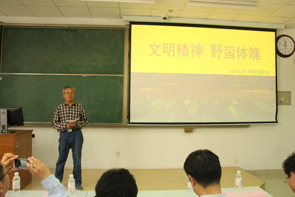 会议开始,播放了由文学院新闻工作室精心制作的运动会风采展视频,其中不仅有学生全力以赴地奔跑,也有教职工的拼搏。当提到赛场上各位运动健儿、志愿者的精彩表现时,两天一直在田径场上为参赛教师、学生,志愿者,加油助威和拍照的党委副书记邹维忠感慨万分。他以幻灯片形式播放了他所记录的赛场上的精彩瞬间;并为现场师生分享了三个在比赛时发生的小故事:5000米长跑肌肉拉伤无法比赛却依旧坚持一圈的俄语1702班托列别尼,“巾帼不让须眉”即使被套圈也坚持到底的音乐1701班王雅云,跑道上连续被四位对手超越跑完连声说“老师对不起,我跑得不好”的韩欣睿。针对参赛学生及教师在运动会上的精彩表现,邹维忠用毛泽东、邓小平、习近平三位领导人的运动健体经历来阐述锻炼的重要性,并向现场全体师生表达衷心的祝福。
