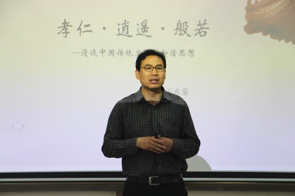 王永豪老师援引古代文化典籍,并借用生活中的现实事例,深入浅出、生动详细地讲解了儒道释三家的思想源流和儒家孝悌仁爱、道家无为逍遥及佛家般若波罗蜜中的和谐思想。首先,他从汉字的起源入手,以“子”“孕”“育”“乳”等甲骨文字样引出了“孝悌”的观念。他表示,家庭观念是社会观念的前提,而孝悌观念正是儒家家庭观念的重要组成部分。随后,他还提及了道家的无为思想和释家的智慧思想。他表示,世界上没有巧合,所有的巧合都是精心安排;在生活中,每个人都应该重视智慧、启迪智慧,以取得更好的人生体验。最后,他引用《论语》等书籍中的内容,从“孔子生平”“孝悌人之本”“入孝出悌”和“喜惧父母年”四个方面重点介绍了儒家的孝悌思想。“‘爱日以承欢,莫待丁兰刻木祀;椎牛而祭墓,不如鸡豚逮亲存。’我们应该及时尽孝,不要等没有机会的时候再追悔莫及。”王永豪老师精彩的解说也引起了观众们的共鸣,现场不时爆发出一阵热烈的掌声,气氛十分活跃。