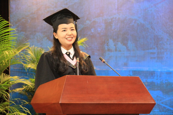 毕业生代表、14级法学专业本科毕业生郑子秋发言,她代表毕业生向一直关心支持同学们的学校学院,老师和家长表达了衷心的感谢,并对未来充满了美好的期盼,表达了毕业生的理想与壮志。