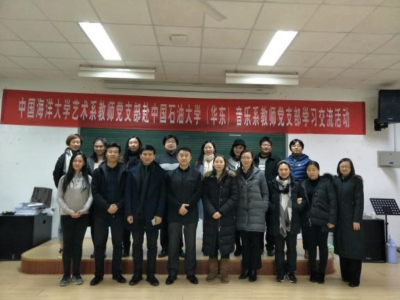 2017年12月14日,中国海洋大学艺术系党支部一行7人,在支部书记张咏春老师的带领下来我系进行支部交流活动。活动在音乐系129 教室举行,文学院音乐系全体党员参加了此次交流。此次活动由音乐系支部书记刘清主持,海大艺术中心党支部书记张老师首先介绍了艺术中心党员活动的基本情况以及相关的活动内容。其后由文学院音乐系系主任苏静介绍了我系人才培养、师资建设等方面的情况,张楠老师介绍了近年音乐系党支部的基本活动。双方在开展支部活动的方式方法、范围等进行了交流,并互相交换了各自对十九大的学习心得,同时也就音乐学科建设、师资力量培养等方面进行了讨论。