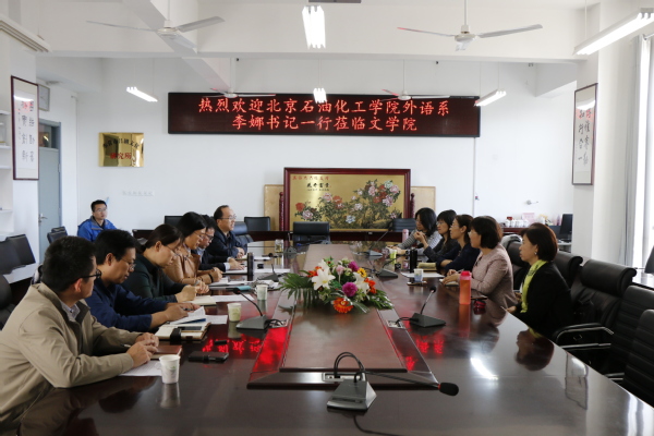 10月19日下午,北京石油化工学院外语系李娜书记一行5人来kaiyun官网调研工作。双方围绕大学外语改革、人文素养教育发展等问题在文理楼358进行座谈。院长王学栋、大学英语系相关负责人参会,副院长王新博主持。