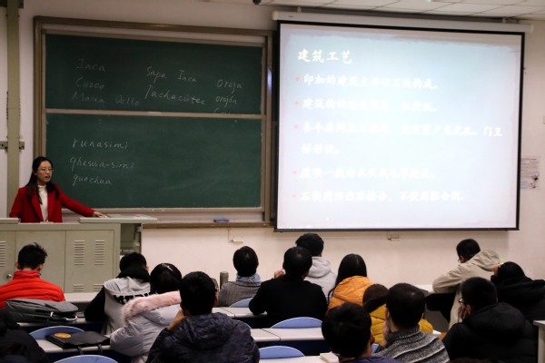 11月18日,由文学院主办的国际文化大观园系列收官之讲《探访神秘的印加王国》于南堂116教室举行。本次讲座由文学院西班牙语讲师赵慧主讲,文学院副院长孙大满出席,对印加文化感兴趣的同学参加。
