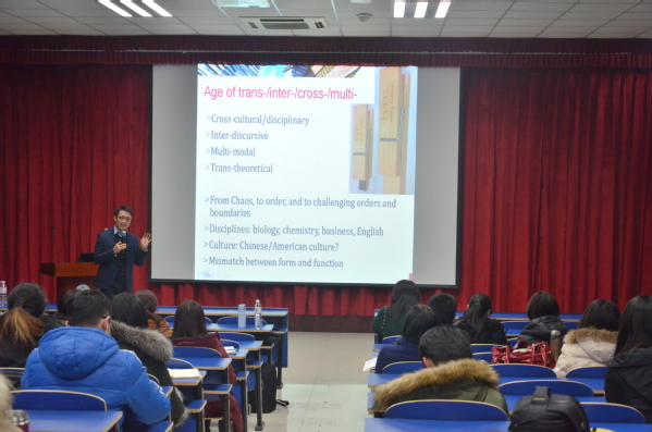 12月12日下午,文学院“文萃英华”系列讲座继续开讲,香港理工大学英文系博士生导师、香港人文学院青年院士冯德正教授受邀在文理楼142做了题为“商务话语研究的多模态方法:兼谈国际期刊论文的写作与发表”的讲座。本次讲座由研究生外语教学部主任郭月琴教授主持,大学英语二系主任彭翠平副教授、英语系副主任潘荔霞老师、各系教师代表以及部分本科生、研究生参加了本次讲座。