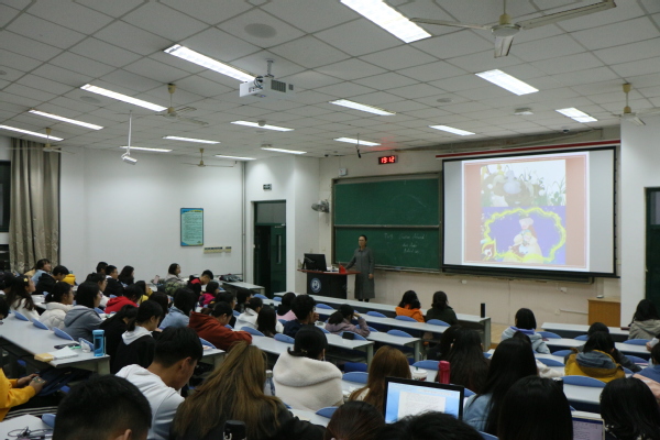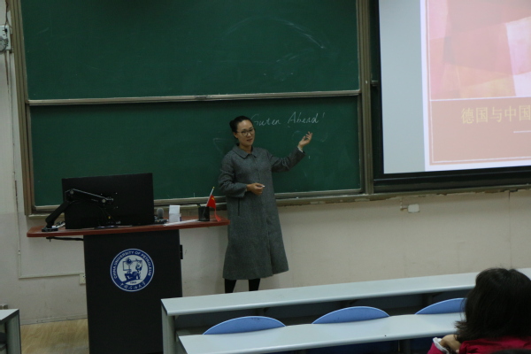 本次讲座由中德文化相遇和碰撞两部分组成。孙锦首先用有趣的德语知识问答引入主题,学生们认真思考,积极回答,现场气氛活跃。在介绍了德国文化的基本特点后,她讲述了格林兄弟搜集故事并编写《格林童话》的过程以及其在德国的广泛影响。进而通过中德对比引出近代中国对童话的态度“中国无童话”和对儿童的教育方式“孩子是缩小的成人”,并介绍了《格林童话》在中国的翻译及传播过程。精彩的讲解与生动的事例使得学生领悟到存在巨大差异的两国文化在 “相遇”过程中彼此融合。