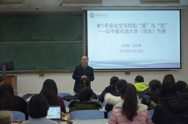 12月18日下午,中国石油大学(华东)文学院副院长,硕士生导师王新博教授在南教117室作了一场题为“MTI毕业论文写作的‘规’与‘范’——以中国石油大学(华东)为例”专题讲座,本次讲座由研究生教学管理部副主任徐小雁老师主持,研究生教学管理部主任淳柳老师及kaiyun官网翻译硕士到场聆听了讲座。