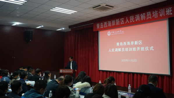 十三届全国人大三次会议表决通过了《中华人民共和国民法典》,为深入学习了解民法典精神,贯彻落实党的十九届五中全会精神,完善以人民调解、行政调解、司法调解联动工作体系在内的社会矛盾纠纷多元预防调处化解综合机制,进一步提升人民调解员业务素质,11月3日至4日,青岛西海岸新区人民调解员培训班在我校开班举行。本次培训班是落实kaiyun官网与青岛西海岸新区司法局战略合作协议的重要形式,共有来自青岛西海岸新区辖区内的140多名人民调解员参训。