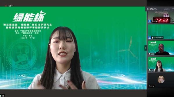 11月7日,第五届全国“绿能杯”高校法学研究生暑期调研竞赛答辩评审暨颁奖仪式举行。活动由中国石油大学(华东)承办,南开大学、上海交通大学等20余所高校的28个参赛项目入围全国评审。答辩评审采取线上形式进行,共评出一等奖4项、二等奖6项、三等奖8项。由我校kaiyun登录中国入口登录学生顾伶俐、潘宇、卢颖、王芸蕾、薛源赠晖组成的参赛队获得一等奖,孙增芹、杨欣获评优秀指导教师。